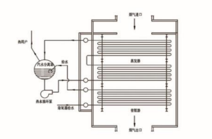 在地下主煙道翻板閥前開孔,熱煙氣從地下主煙道引出,經(jīng)煙道到余熱鍋爐入口,煙氣自下而上流動,流經(jīng)蒸發(fā)器和省煤器,經(jīng)鍋爐出口的引風(fēng)機(jī)再排入主煙道,經(jīng)煙囪排空。煙氣溫度從280"C 降至160'C,所放出的熱量用來使水變成0.8MPa飽和蒸汽。